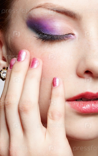 Половина лица с ярким макияжем и рука с маникюром