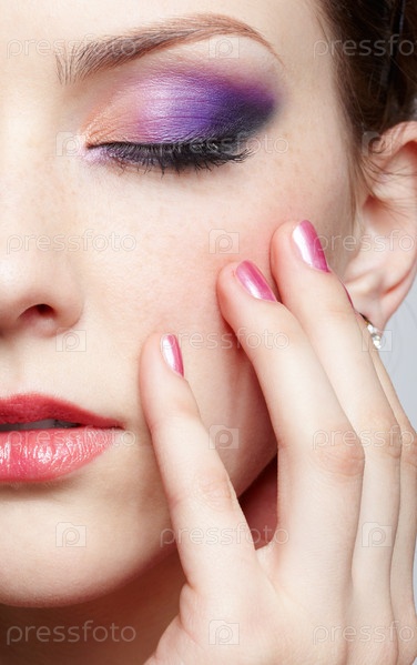 Половина лица с ярким макияжем и рука с маникюром