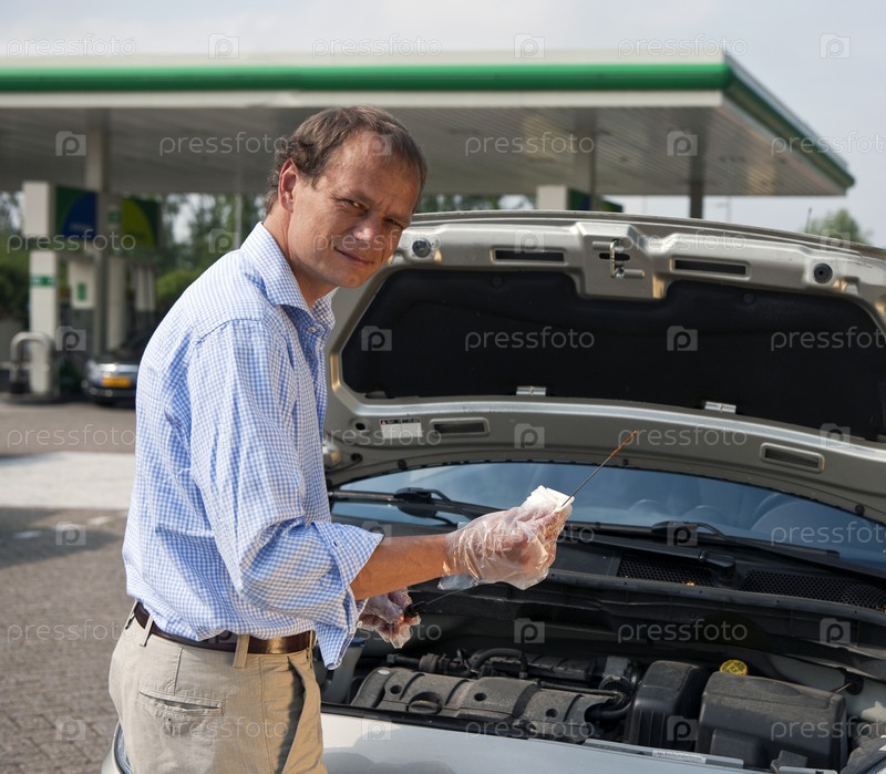 Мужчина проверяет уровень масла в своей машине