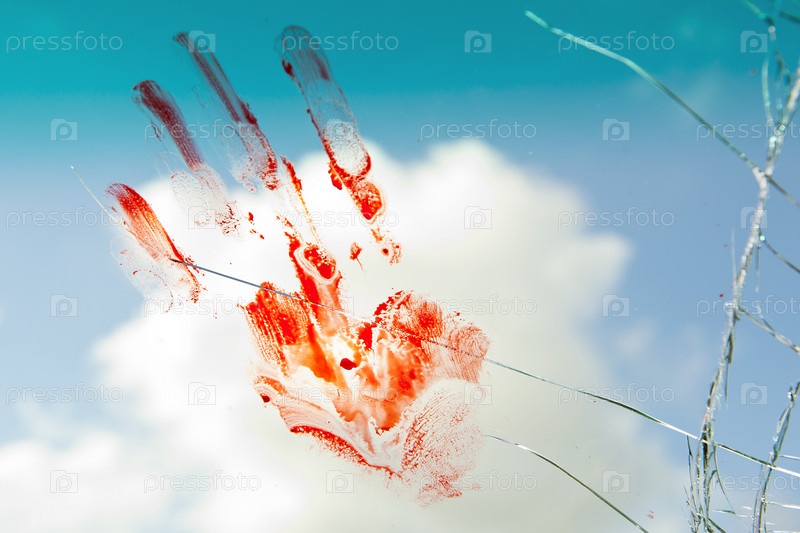 Кровавый отпечаток ладони на треснувшем лобовом стекле