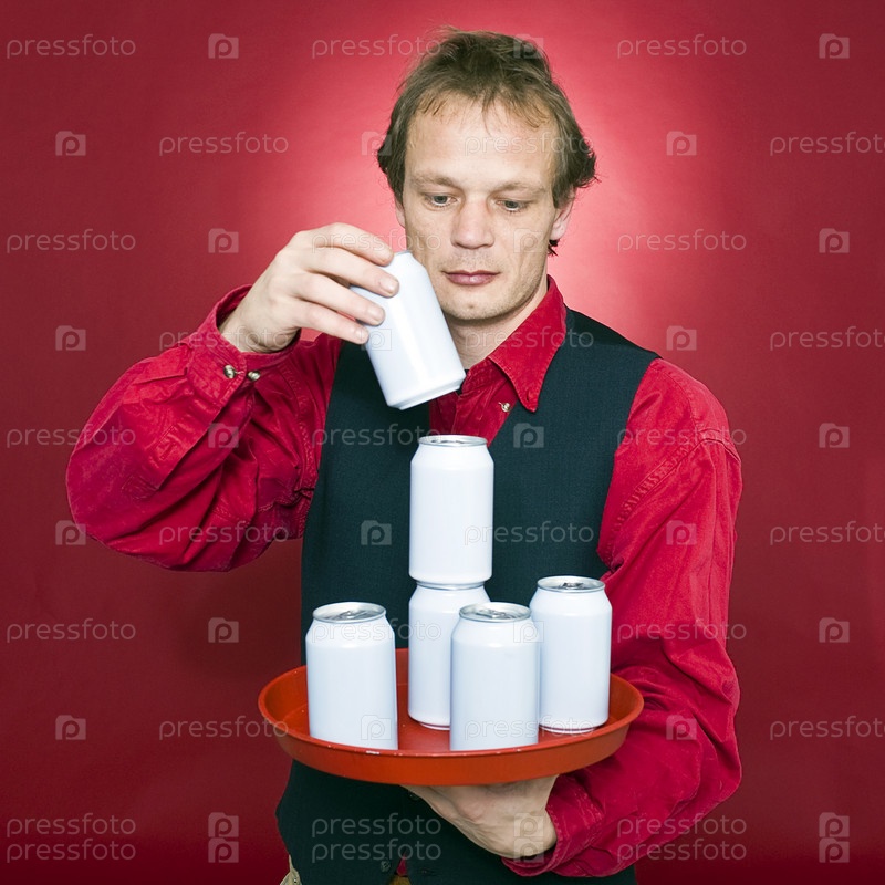 Официант ставит банки на поднос