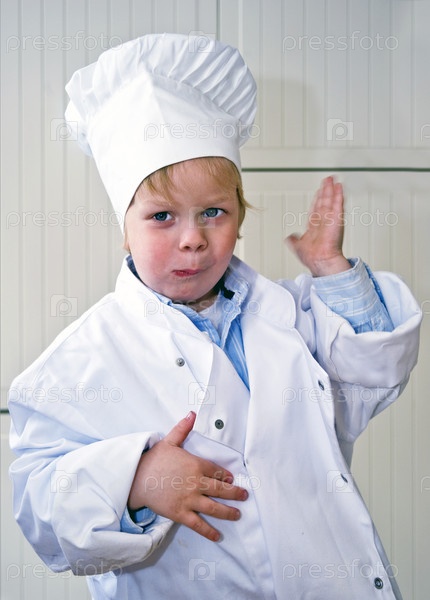 Маленький мальчик в форме шеф-повара пробует еду