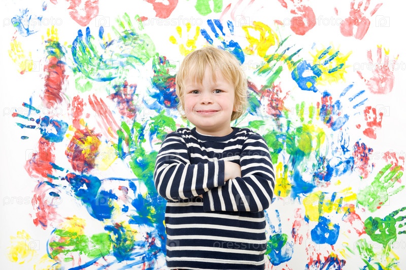 Маленький мальчик на фоне его рисунка