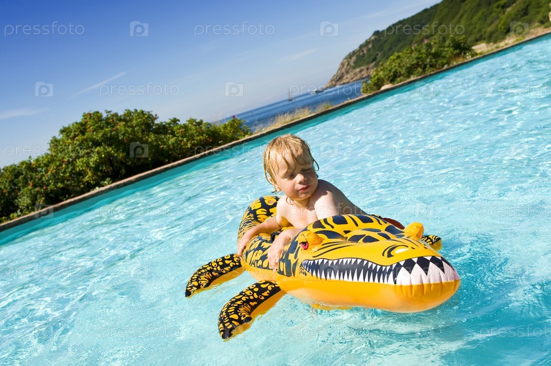 Мальчик плавает на надувном крокодиле