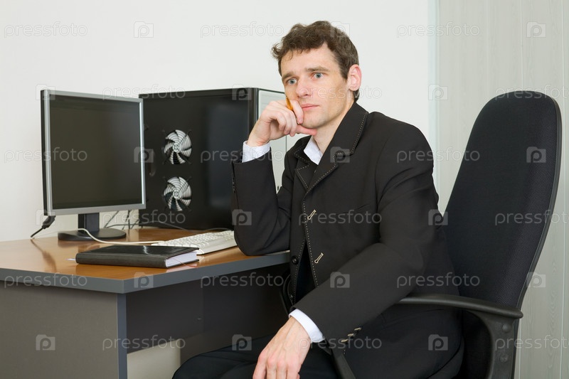 Молодой бизнесмен сидит за столом в офисе