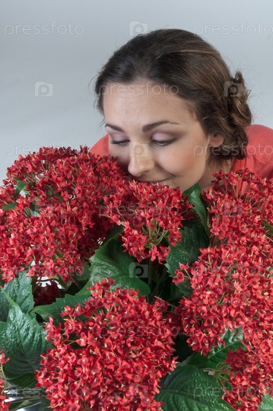 Портрет молодой красивой девушки с букетом красных цветов