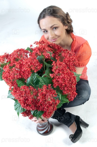 Портрет красивой девушки с букетом красных цветов