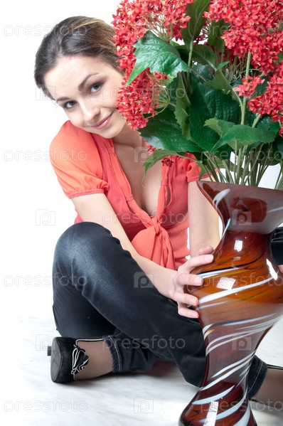 Портрет красивой девушки с букетом красных цветов