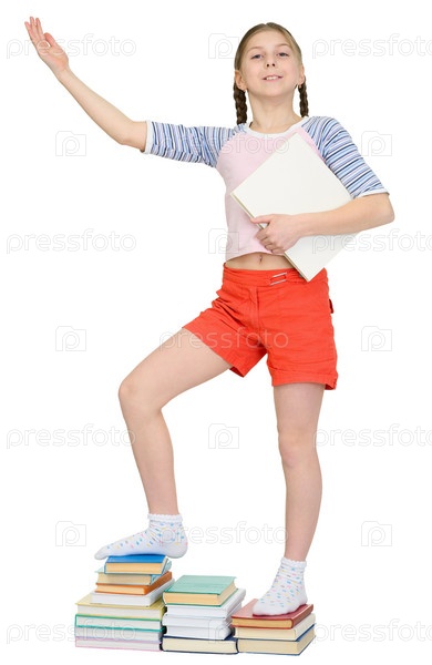Девочка с книгой на пьедестале из учебников на белом фоне