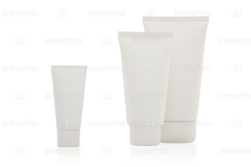 Три белых косметических тюбика стоят на белом фоне