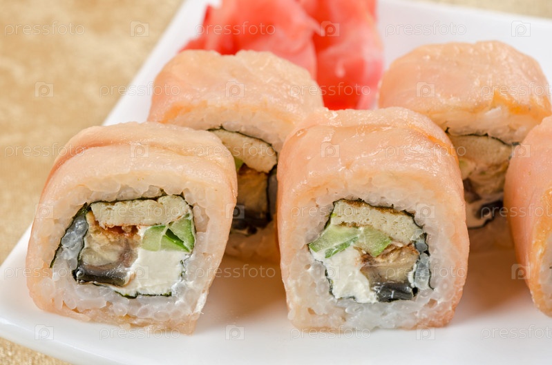 Суши с креветками, угрем, огурцом, перцем и соусом