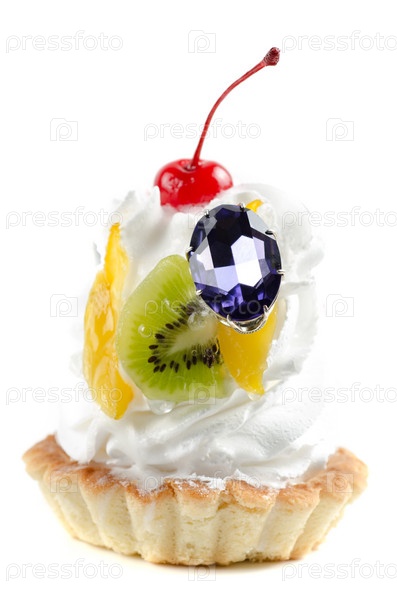 Пирожное с ювелирным украшением на белом фоне