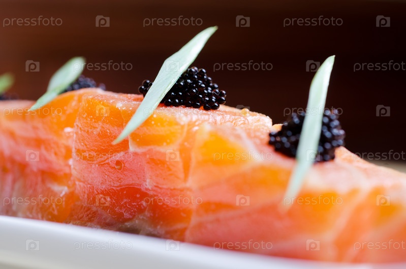Ломтики лосося с икрой тобико и зеленью