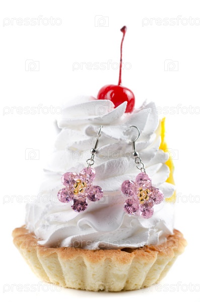 Кекс и бижутерия на белом фоне