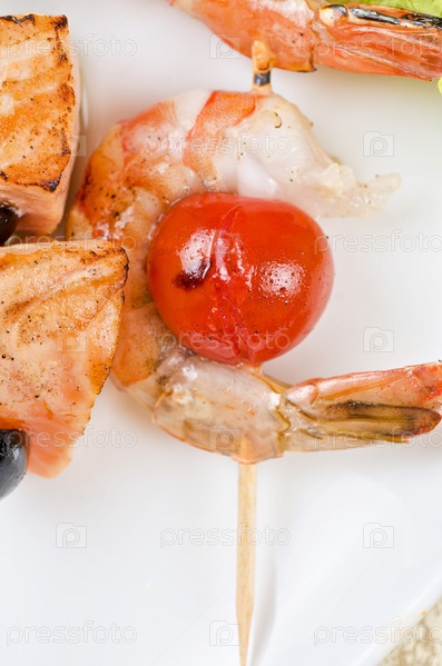 Жареные креветки и помидоры на бамбуковых палочках с лососем