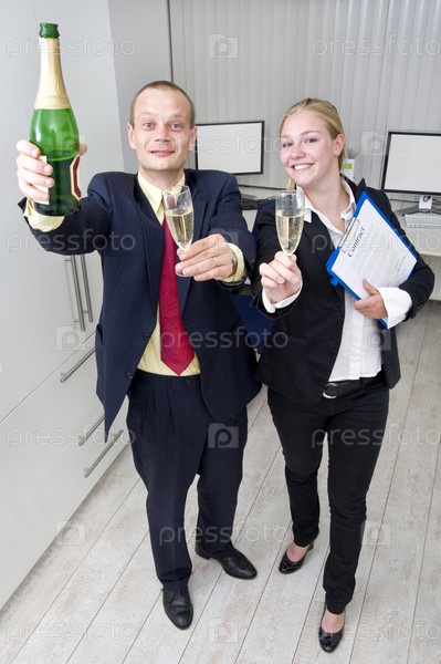 Успешные коллеги с бокалами шампанского в офисе