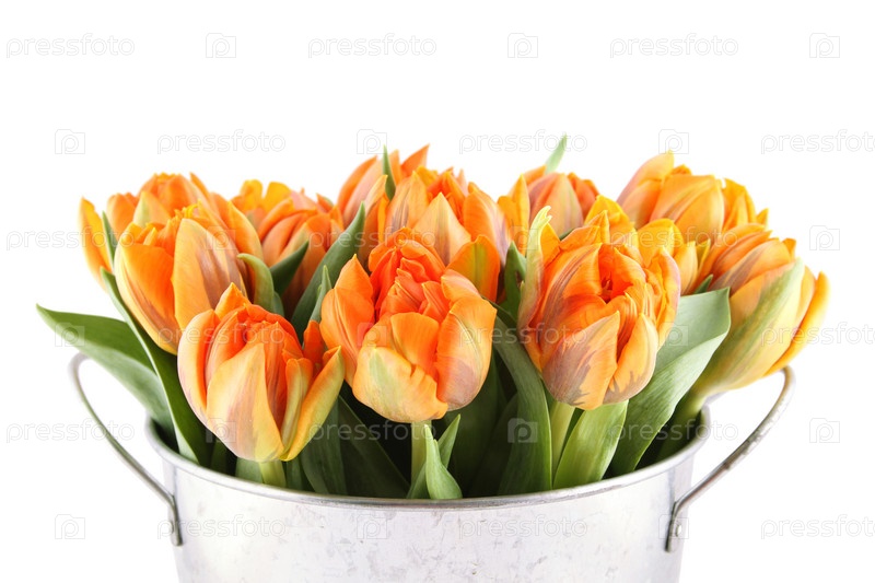 Красивый букет из белых тюльпанов в кастрюле на белом фоне
