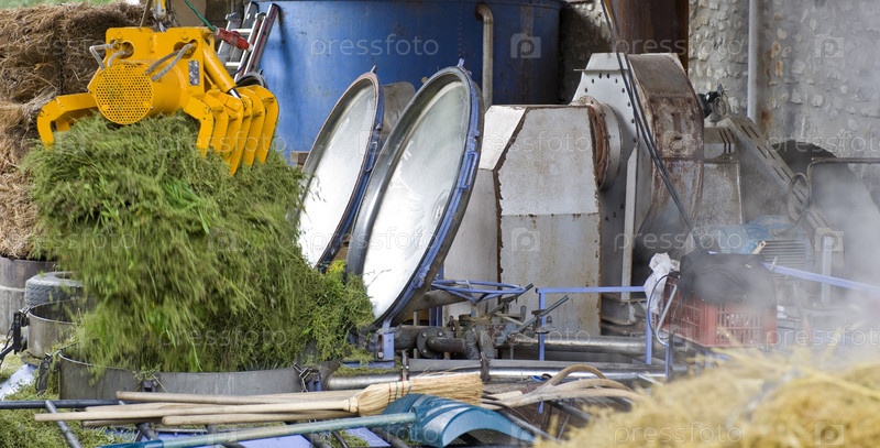 Мостовой кран выгружает траву в промышленный пресс, используемый для получения натуральных растительных экстрактов
