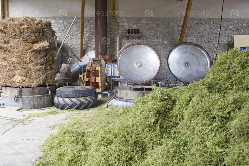 Завод травяных экстрактов с кучей тимьяна на переднем плане, тюком лаванды и прессами для приготовления натуральных растительных экстрактов