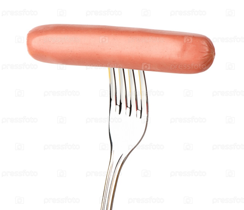 Колбаса на вилке на белом фоне