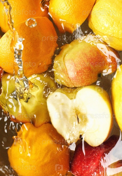 Свежие яблоки, лимоны и апельсины в воде