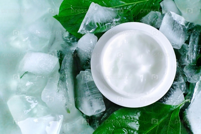 Миска косметического крема со свежими зелеными листьями и кусочками льда