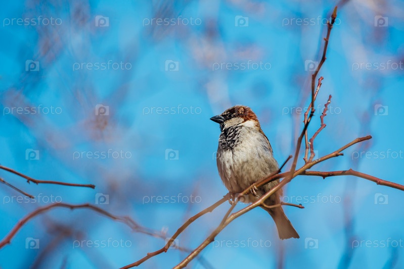 Маленький воробей сидит на ветке