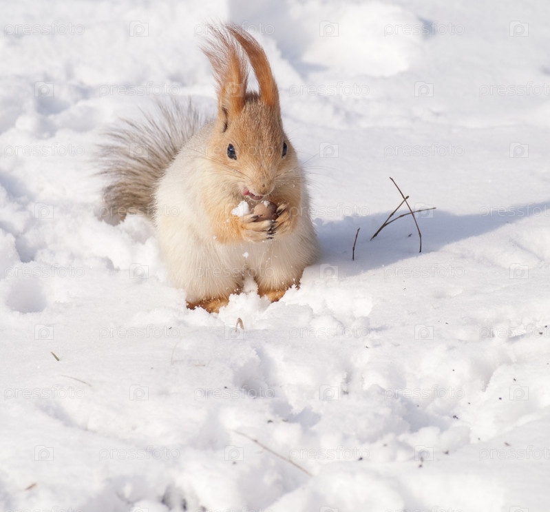 Белка на снегу,поедающая орех