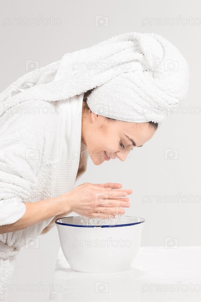 Молодая женщина моет лицо чистой водой