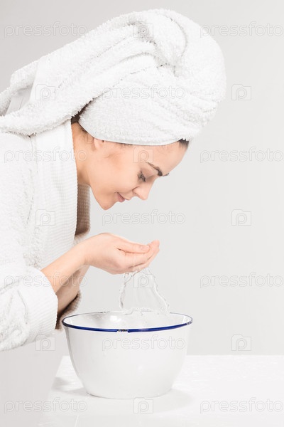 Молодая женщина моет лицо чистой водой
