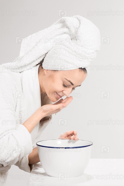 Молодая женщина моет лицо чистой водой