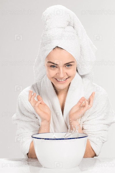 Молодая женщина моет лицо чистой водой