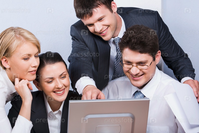 Бизнесмен объясняет правильный способ анализа своим коллегам в офисе, указывая на монитор