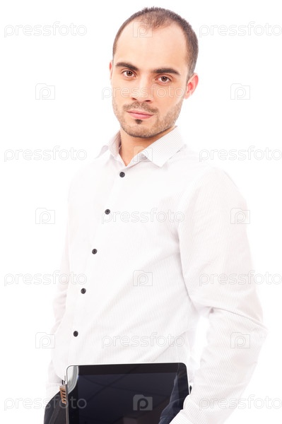 Мужчина с планшетным компьютером, изолировано на белом фоне
