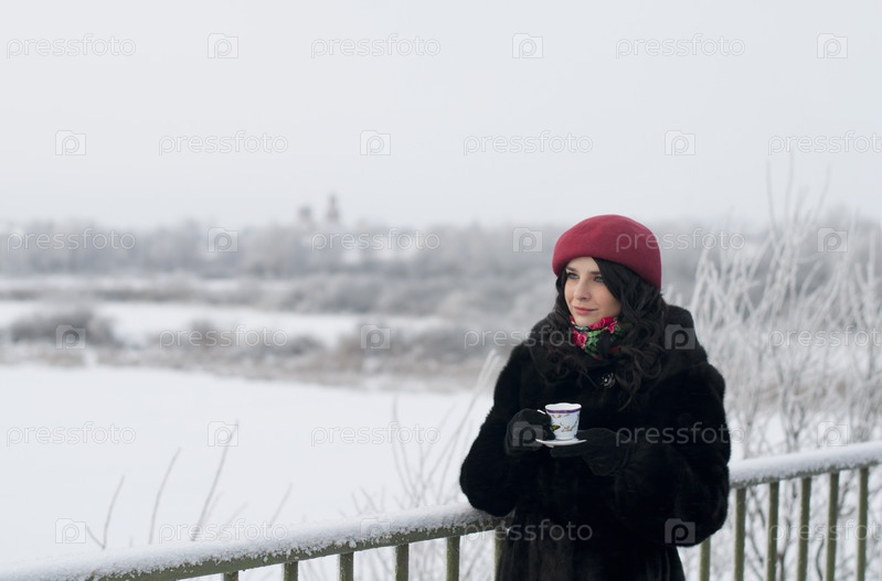 Красивая девушка в зимней одежде пьет чай на природе