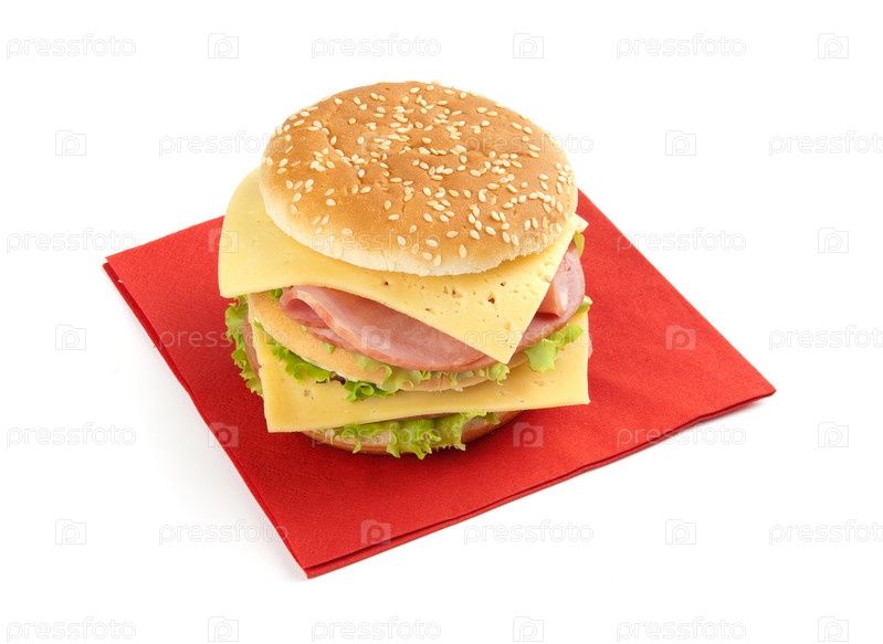 Фаст-фуд, бутерброд с салатом, ветчиной и сыром