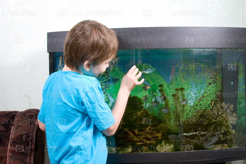 Мальчик смотрит на аквариумных рыбок у себя дома