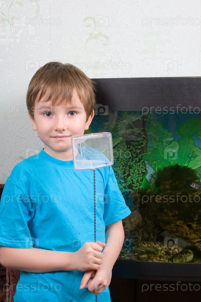 Мальчик с сачком у домашнего аквариума