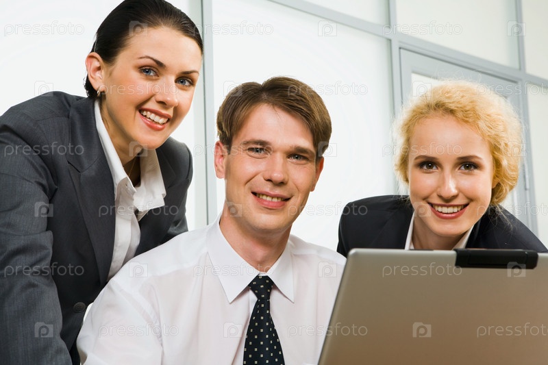 Портрет трех бизнесменов, смотрящих на камеру в рабочей среде