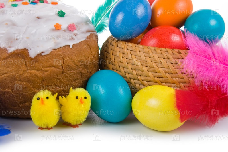 Пасхальные яйца и кулич, изолировано на белом фоне