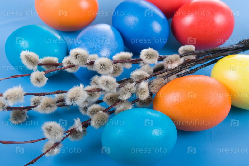 Пасхальные яйца и веточки ивы на синем фоне