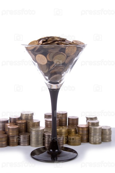 Стопки монет и бокал с монетами, изолированные на белом фоне