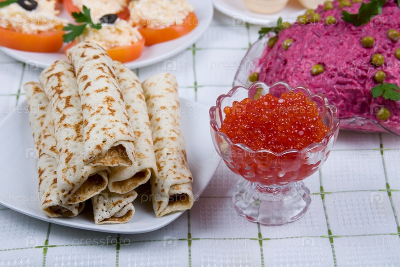 Блинчики с красной икрой на тарелке. Традиционный русский праздничный стол