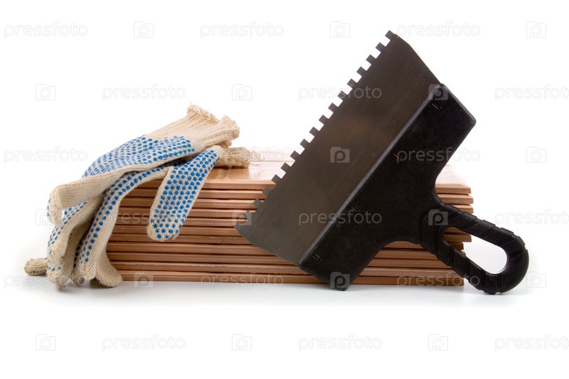 Керамическая плитка и инструменты для ремонта на белом фоне