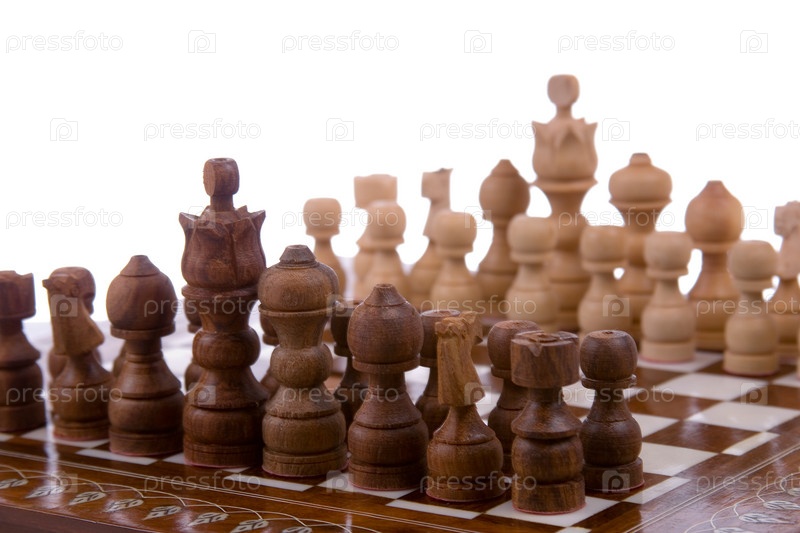 Деревянные шахматы на белом фоне