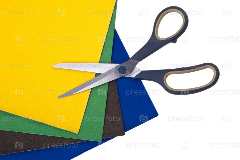 Ножницы на цветной бумаге на белом фоне