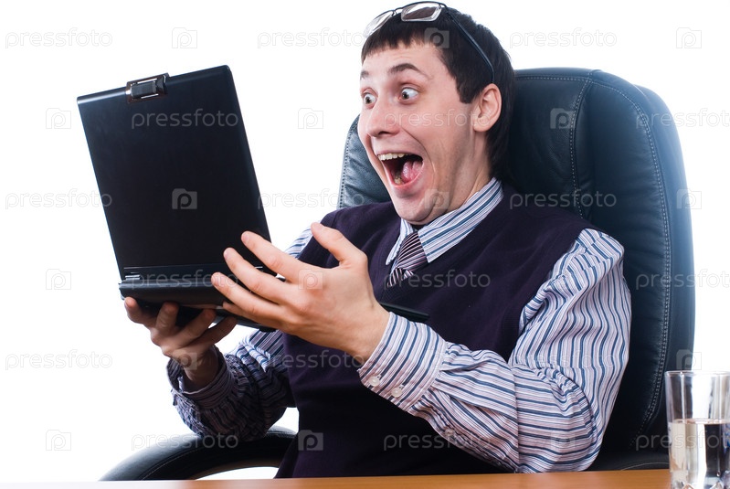 Молодой шокированный предприниматель читает сообщение на ноутбуке