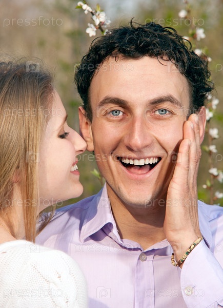Портрет молодой романтичной пары на открытом воздухе весной
