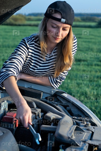 Женщина ремонтирует машину