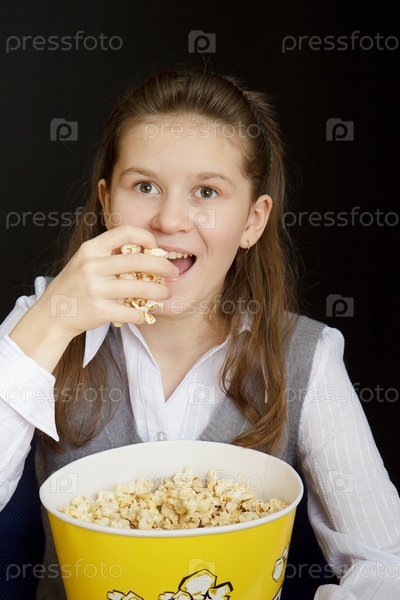 Эмоциональная девушка с попкорном на черном фоне
